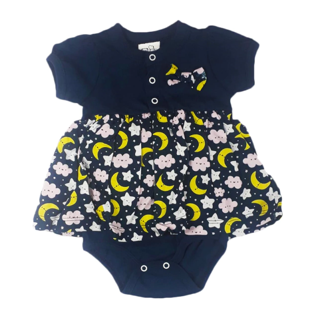 Peça super estilosa e com designer diferenciado, além disso conta com uma estampinha de lua e nuvemzinha na saia e também no lindo laçinho do body na parte frontal superior.